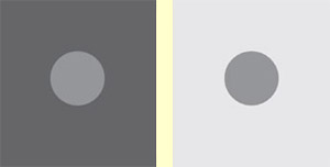 circles that are the same shade of grey, the one placed on a dark background will