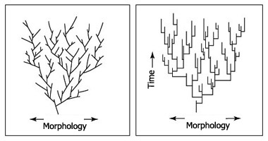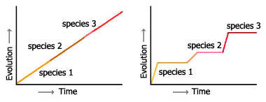 versus evolution by punctuated equilibria. In the case of gradualism (left), the