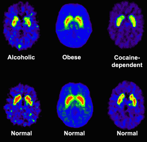 In these images of the brain, the red areas indicate large numbers of dopamine receptors. These images show that people who are alcoholic, obese, or cocaine-dependent have fewer dopamine receptors than normal people do. |
