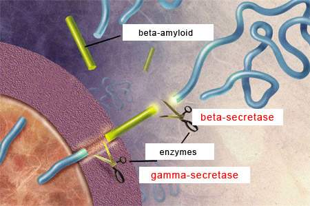 First, beta-secretases cut the APP’s chain of amino acids at a certain distance outside the cell membrane. Then gamma-secretases make another cut, this time inside the cell membrane, thus releasing the beta-amyloid peptide.