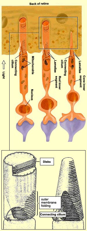 joined by a connecting cilium. The inner segment of each photoreceptor